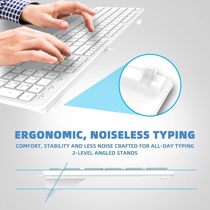 - 【Ultra Slim & Ergonomic Design】 The B.FRIEND silent wired keyboard features ultra-thin high-end scissor switch silent keys. It’s can accommodates most typing habits while taking up less space than traditional full-sized keyboards. The ultra slim wired keyboard has 17.3x4.8x0.3in(44*12*0.8cm).This ultra slim wired keyboard has ergonomic folding stand to provides optimal wrist support at a thoughtful angle, effectively reducing muscle strain during extended use, providing all-day typing comfort
