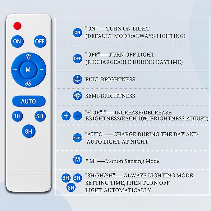 - 【Three Mode & Fout Lighting-Adjustment & Five Timings Control】:he solar flood lights outdoor has three modes: Light Sensing Mode(Automatically turns off during the day), Motion Sensing Mode(Automatically turns on when someone passes by) & Long-distance Control(remote control distance up to 32 ft). Our multi-function remote control with 5 levels of brightness adjustment, in addition to 3 timing groups: 3H/ 5H/8H, you can choose the appropriate mode according to your needs