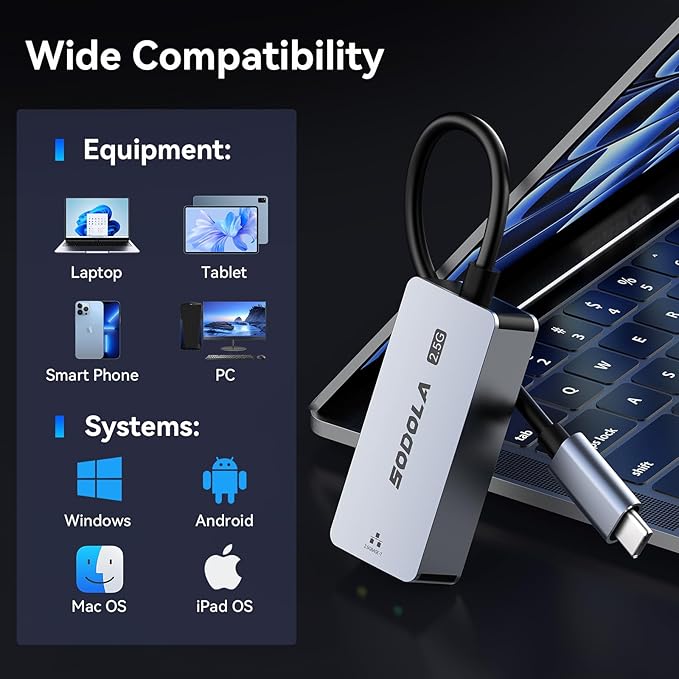 Sodola USB C to Ethernet Adapter 2.5G, Ethernet Adapter for Laptop, Aluminum, Type C to RJ45 Network Internet LAN Adapter, Compatible for NAS, MacBook Air/Pro, iPhone 15/16 Pro/Max