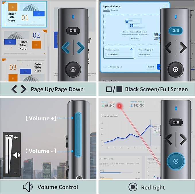 - 【Wide Compatibility】The slide pointer for presentations is compatible with various operating systems, including Linux, Windows XP 7/8/10 or above, Mac OS 3 or above, and Android 4.3 or above. It also supports popular software such as PowerPoint, Excel, Prezi, Google Slides, iWork (Keynote & Numbers & Pages), and websites.