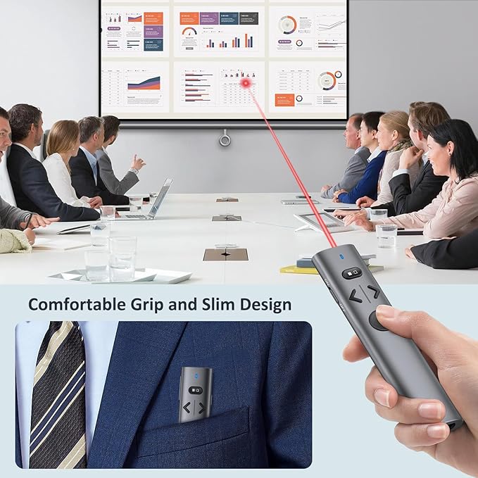 - 【Easy to Use】Lightweight and small in size, easy to carry. This wireless clicker for PowerPoint presentations is plug-and-play without software installation. The receiver adopts a magnetic design to avoid being lost when not in use. This red laser has 1* Wireless Presenter, 1* 2-in-1 Receiver, 1* Type-C Cable, 1* Pouch, 1* User Manual.