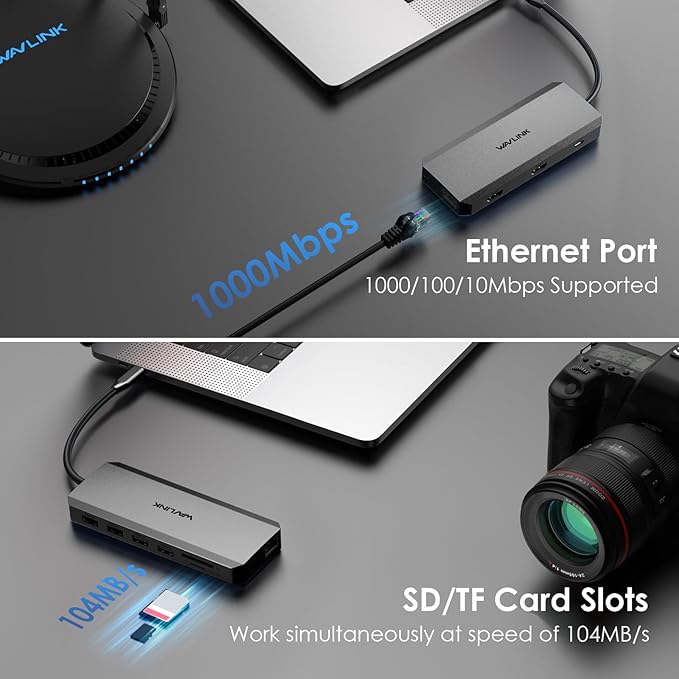 WAVLINK USB C Docking Station Dual Monitor, Triple Display, USB C to 2 HDMI,DisplayPort, PD Charging, Ethernet, 5 USB, SD/TF Read, Audio for MacBook Dell HP Lenovo Surface, Dark Grey