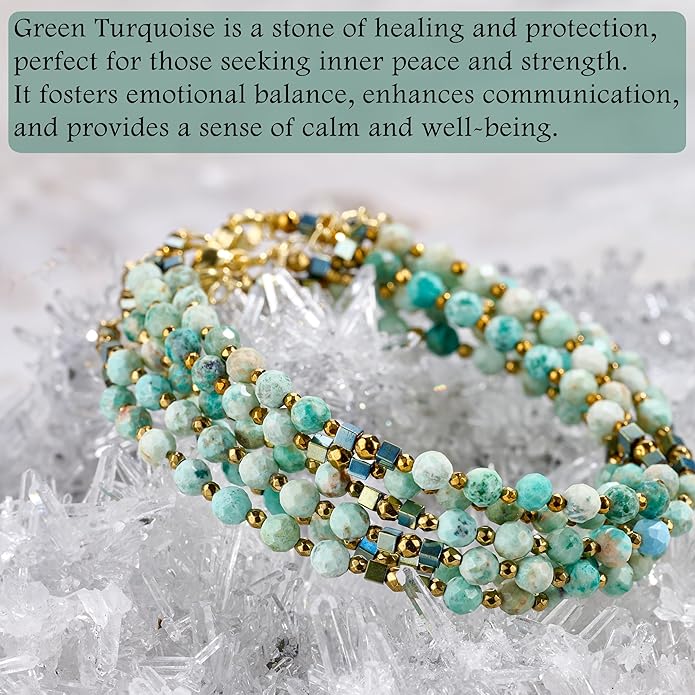 - Chakra Green Turquoise Bracelets: Green Turquoise is connected to the heart and throat chakras, promoting honest communication. This soothing stone opens and balances these energy centers, aiding in the expression of one's true self. Perfect for individuals seeking to foster deeper connections with others and enhance their ability to communicate openly and authentically