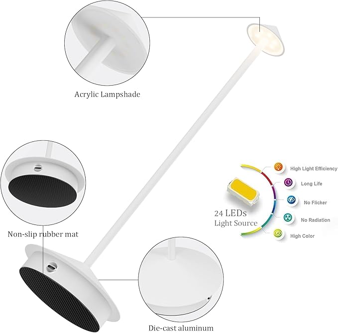 - Product Specifications: The desk lamp has a power rating of 3W and a brightness of 240 lumens. It stands at 13.7 inches in height, with a circular base diameter of 4.3 inches, and weighs 1.43 pounds per unit. This modern minimalist portable desk lamp is suitable for use on bedside tables, dining tables, in cafes, hotels, outdoor camping, and balcony lighting scenarios.