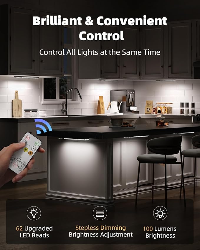 - Remote Control & Timer Features: Control these under counter lights easily with either the built-in buttons or the included remote. Set the closet lights to always on/off, adjust brightness, or switch between color temperatures. The remote also offers a timer function with six options, from 15 to 120 minutes, providing flexible control over how long the light stays on.