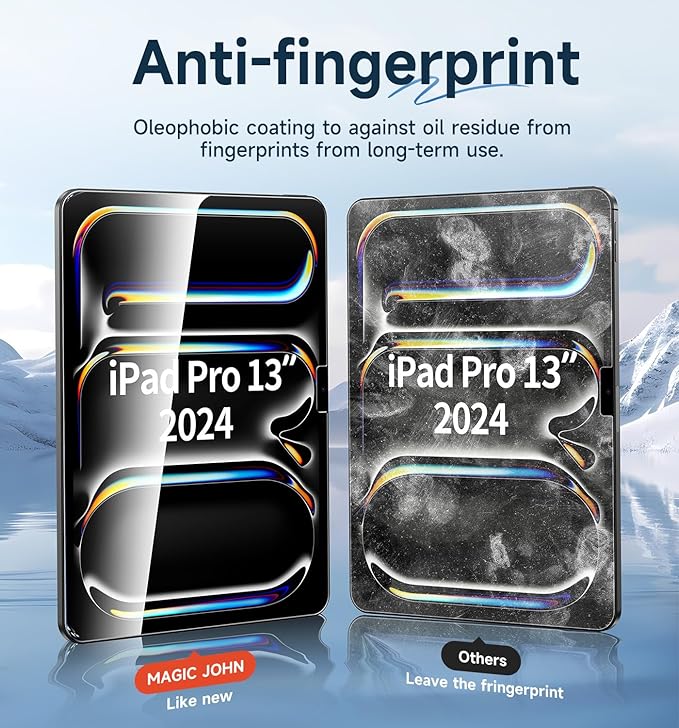 - [Anti-Fingerprint] MAGIC JOHN tempered glass screen protector for iPad Pro 13 inch is finished with oleophobic coating to against oil residue from fingerprints from long-term us