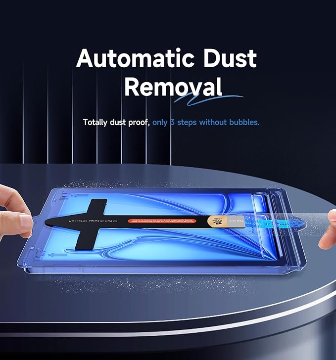 - [Automatic Dust Removal Tech] Just cover and pull, the screen protector automatically aligns and takes away the dust. No more worrying about bubbles and dust. Watch our Installation Video to see how easy it is to use our Dust-Elimination Installation Screen Protector