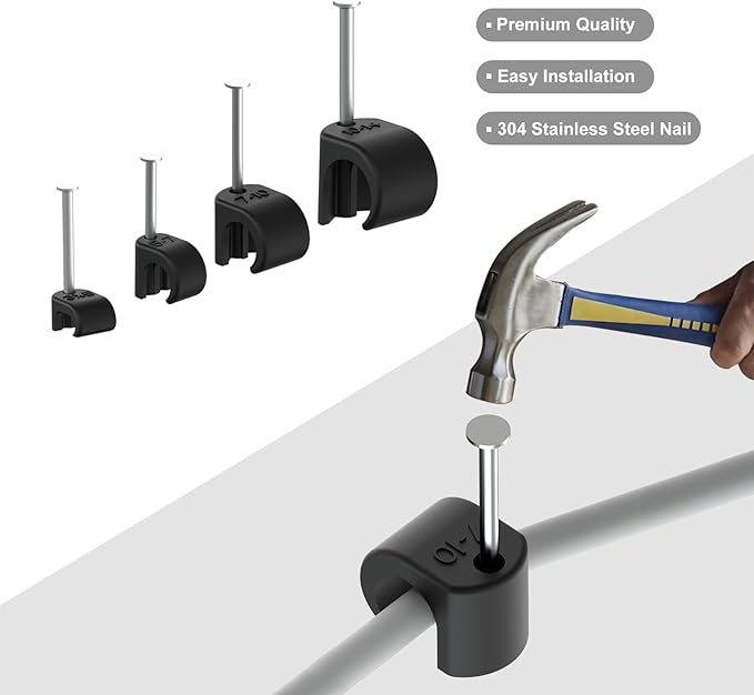 - Premium 304 Stainless Steel Nails: Each cable clip is equipped with high-quality 304 stainless steel nails that resist rust and corrosion, ensuring a secure hold on various surfaces for long-term use.
