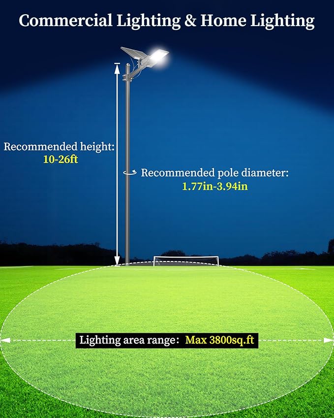- [Intelligent Control & Easy to Install] - The solar flood security light comes with a remote control, convenient for long-distance use. 2 lighting modes (constant light mode, timer setting mode) and 10%-100% brightness adjustable. 3 timing groups: 3H/5H/8H. Comes with a set of wall and pole mount accessories that require no wiring for easy outdoor installation. Great for streets and roads, parking lots, basketball courts, garages, gardens, streets, courtyards, etc.