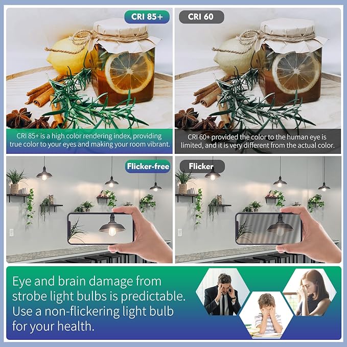 - Healthy and safe LED Bulb: Contain no mercury, no UV or IR, no dazzling, flicker-free, outstanding heat dissipation. Unlike most filament bulbs and Incandescent bulbs, their outer shell is made of highly transparent plastic, which looks like glass It is more safer during transportation and use.