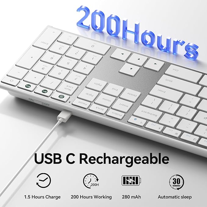 - Rechargeable Battery & Energy-Efficient: Our slim keyboard's built-in rechargeable lithium battery ensures long-term use, with one full charge offering over 30 days of usage time. Additionally, our wireless flat keyboard conserves energy by entering sleep mode after 30 minutes of inactivity.