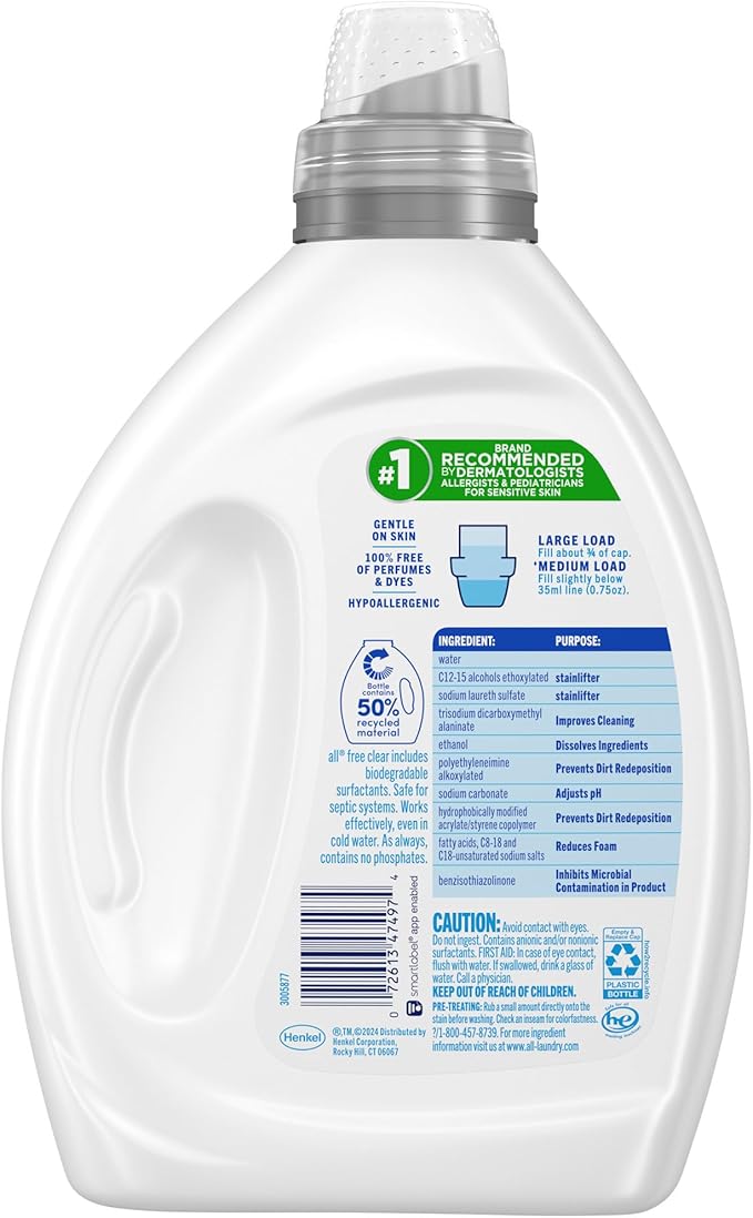 all free clear, Original, Liquid Laundry Detergent for Sensitive Skin, Unscented and Hypoallergenic, Concentrated