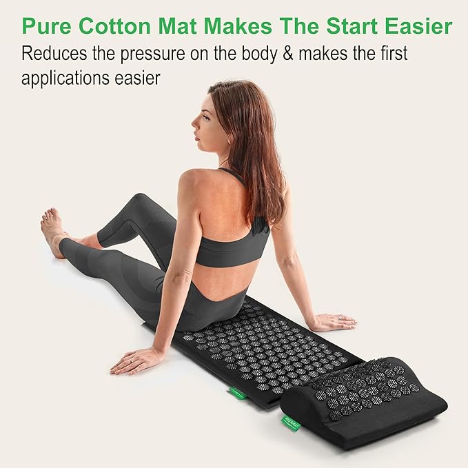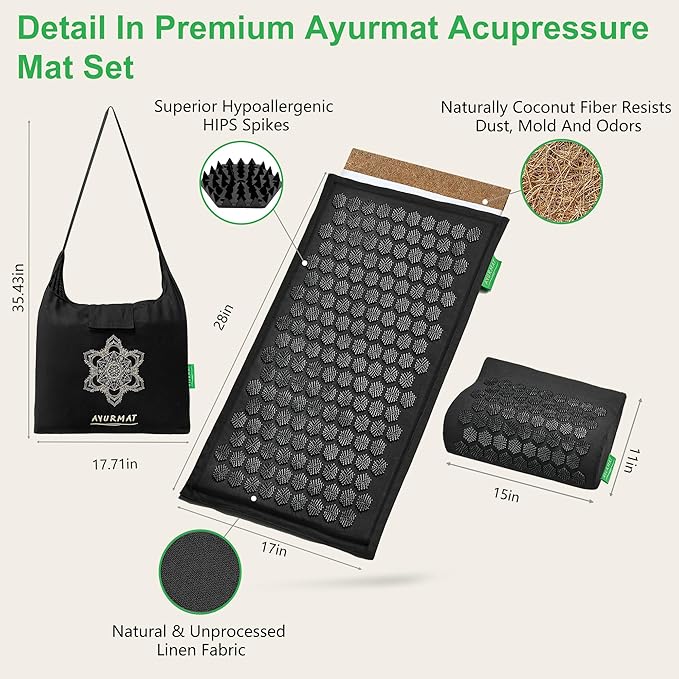 - HIGH QUALITY: The AyurMat acupressure mat and pillow set made of pure linen, filled with natural coconut fibers. It is handmade, in accordance with ethical standards, and undergoes rigorous quality testing. It is free of harmful substances, safe for direct skin contact and longer lifespan. AyurMat acupressure mat and pillow set provides better support for relieving back, lumbar muscle fatigue, and sciatica.