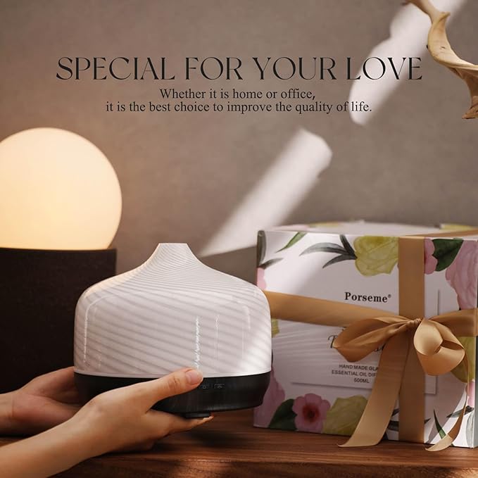 Porseme 500ml Glass Essential Oil Diffuser Aromatherapy Ultrasonic Cool Mist Humidifier 15-21 Running Hours Waterless Auto-Off Air Diffusers for Sleeping Yoga Office Working Spa and Rest (Pure White)