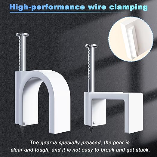 - Easy Install:The installation steps of the clamp are very simple. Insert the cable into the clamp slot and knock the nail into the installation surface with a hammer. Suitable for all kinds of surfaces, such as walls, wood, gypsum, cement, brick desktop, skirting board, etc. These cable clamps are easy to disassemble and can be reused.