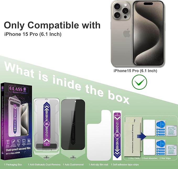 - Automattc Dust Removal Technology:Say goodbye to installation hassles with our iphone 15 pro screen protector! Simply close and pull to automatically align and remove dust—no more worries about air bubbles or dirt. Watch our installation video for easy steps and tips for the second pack. Perfect for those using a privacy screen iphone 15 pro
