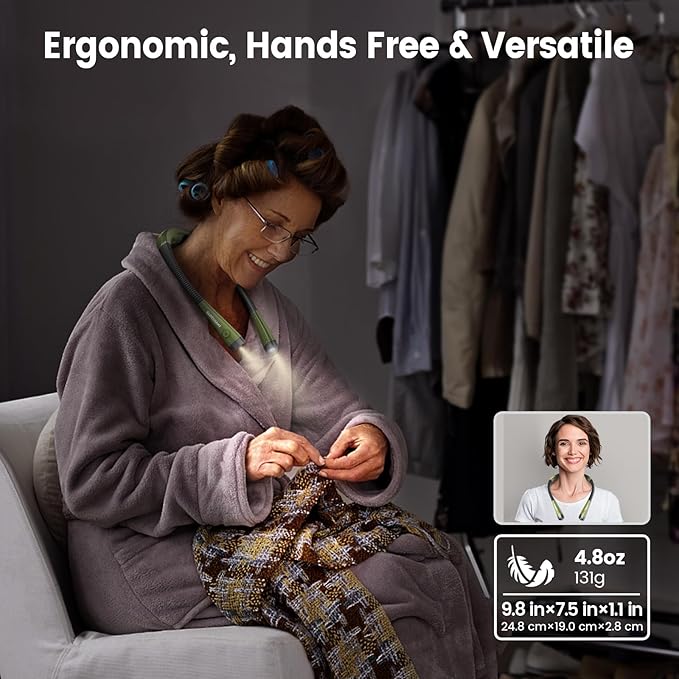 - [Eye Caring & Ergonomic Design] Blue light filter and no flickering design by the advanced LED beads of the Glocusent reading light. Compared with other reading lights for books in bed, you feel no more eye strain with the Glocusent book light. The arms of the reading light around your neck are supple and adjustable so you can get the angle most comfortable for you. This around the neck reading light is ergonomically designed, it is an exceptional handsfree neck lamp for reading!
