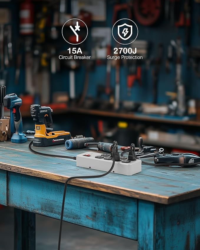 - Comprehensive Protection: this outdoor surge protector delivers 2700 Joules of protection and a 15Amp circuit breaker, ensuring your equipment remains safe from unexpected power spikes. The industrial-grade shop power strip is not just a device; it's a safeguard for all your electrical applications.