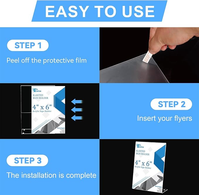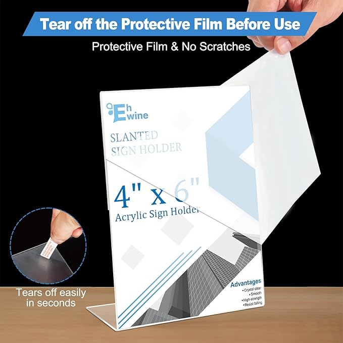 - Easy to Use: Each of our Acrylic Sign Holder comes with a peel off film guide, follow the red arrows to peel off the film in seconds, and the plastic sign holder has an opening on its side for easy paper insertion