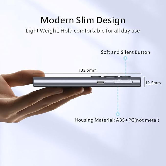 - High Capacity Rechargeable Battery - The wireless presenter is equipped with a 300mAh lithium polymer battery. With 2-3 hours fully charge, the presentation clicker can work for weeks. Indicator blinking slowly is low power alert. Charging via USB-C port and charging cable is included.