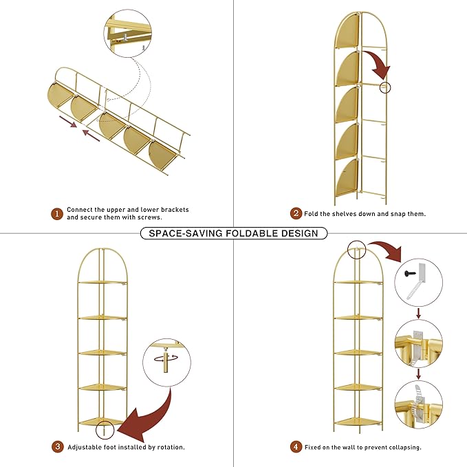 Crofy Foldable 5 Tier Corner Shelf, Metal Corner Plant Stand with Gold Frame and Gold Shelves, Corner Display Rack Multipurpose Shelving Unit for Living Room, Bedroom, Bathroom