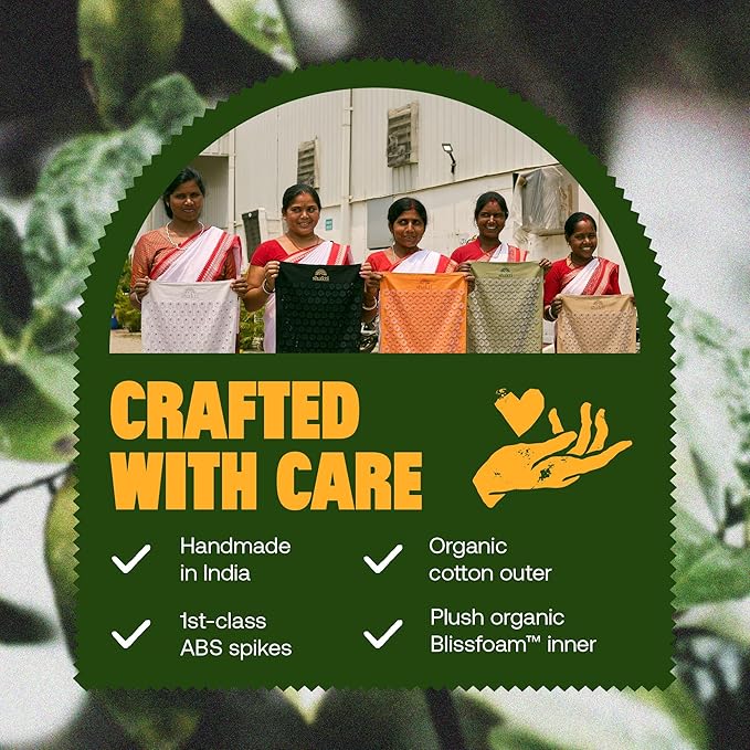 - QUALITY MATERIALS: Handmade in a Fairtrade factory with certified organic cotton, 1st-class ABS spikes and organic Blissfoam for a sinking sensation that feels better than a back massage.