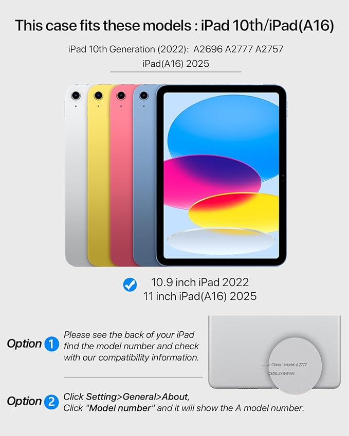 - Compatibility: This heavy-duty protective case is exclusively designed for the Apple iPad 10th Generation 10.9-inch 2022 and iPad (A16) 11 inch 2025. Compatible model numbers: A2696, A2757, A2777, A3354, A3355, A3356. Not compatible with any other iPad models. Please verify your iPad model number before purchase to ensure a proper fit