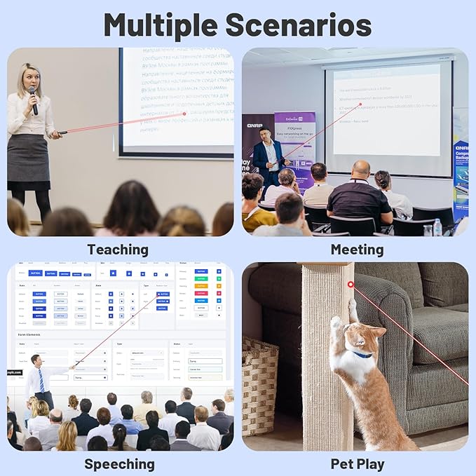 - 【LONG RANGE WIRELESS PRESENTATION CLICKER】The red light pointer for presentations can easily highlight key areas of the slides. The red light projection distance is up to 656 feet, the 2.4G wireless range is up to 165 feet, and the 360°flexible control allows you to freely and flexibly interact with the audience outside the screen