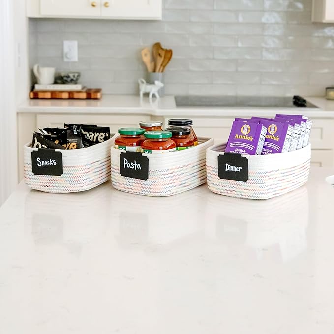 - Safe, Natural Cotton Organizer Bins: Crafted from the highest quality material in the market, our storage bins are oh-so-sturdy (and cute) and ready to take on little humans. They’re 100% safe, so you can rest easy if teething toddlers take a nibble. Reinforced Hidden Handles: Now you see ‘em, now you don’t! With completely hidden handles that blend seamlessly into the rope basket, you’ll be the Houdini of home organizing. They’re even double-stitched and reinforced for extra heavy loads!