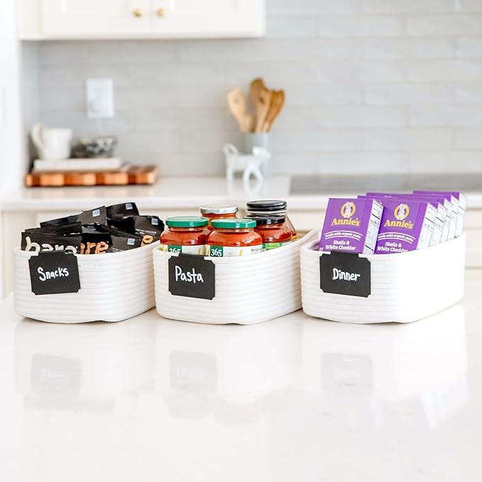 - Safe, Natural Cotton Organizer Bins: Crafted from the highest quality material in the market, our storage bins are oh-so-sturdy (and cute) and ready to take on little humans. They’re 100% safe, so you can rest easy if teething toddlers take a nibble. Reinforced Hidden Handles: Now you see ‘em, now you don’t! With completely hidden handles that blend seamlessly into the rope basket, you’ll be the Houdini of home organizing. They’re even double-stitched and reinforced for extra heavy loads!