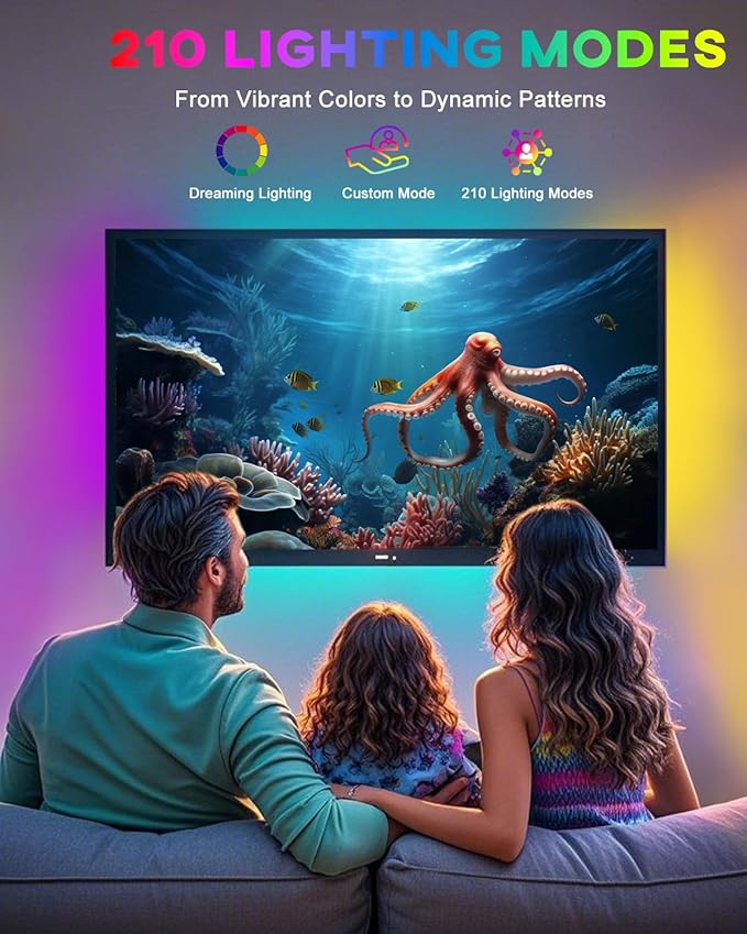 - 【APP Remote Control & 213 Modes】---Seamlessly manage your lighting with the LED light strip's APP and remote control capabilities. Enjoy the convenience of adjusting settings and colors at your fingertips for a personalized lighting experience. explore a stunning array of 213 lighting modes to suit any mood or occasion. From vibrant colors to dynamic patterns, this LED Strip offers endless possibilities to illuminate your space in style