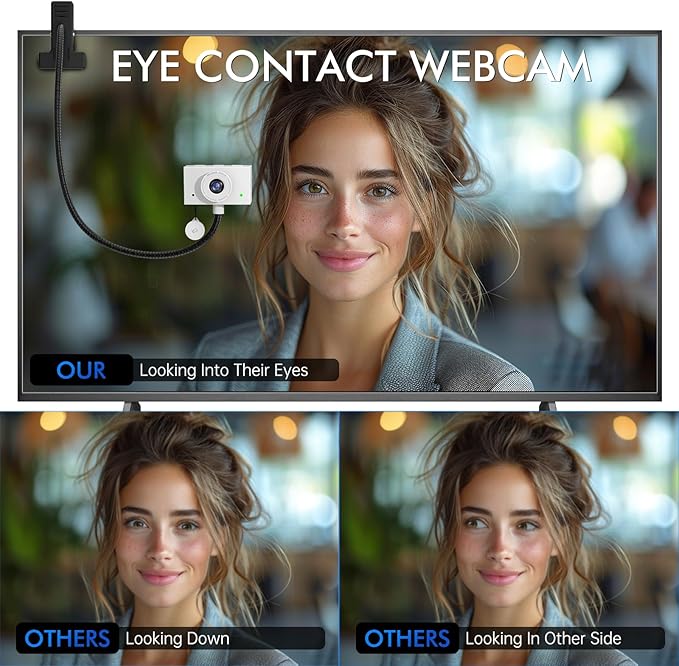- 【Eye Contact Webcam for Natural Communication】 Designed for authentic interactions, this eye contact webcam clips easily to your desktop monitor, keeping the lens at eye level. By placing the web cam at the screen’s center, it helps foster trust and connection during online meetings, making it perfect for FaceTime, presentations, or exams. When not in use, it conveniently slides to the screen's side, maintaining an organized setup.