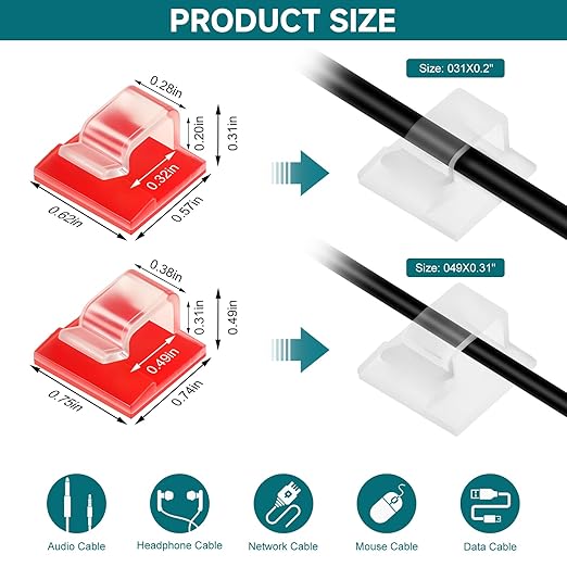 - WIDE APPLICATION: The cord management have 3 colors (Black,Clear,Translucent) and 2 inner diameter sizes ( 032 "x 0.2",0.49"x 0.31") to meet your different needs. The wire clips can be used in home, office, car, etc. It can hold most of the wires such as network cables, TV coaxial cables, USB cables, mobile phone charger cables, Ethernet cables and so on.