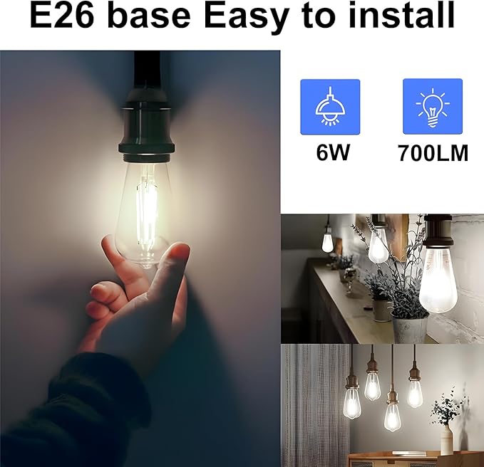 - 4、E26 BASE & EASY To INSTALL:These ST19 dimmable E26 LED light bulbs are designed to fitting 2.28*5.15 fixture, perfectly match your existing ST19 Bulbs.With a standard E26 medium base, ST19 E26 LED bulb 60 watt dimmable easily screw into most light fixtures, making them ideal as light bulbs for recessed ceiling lights.