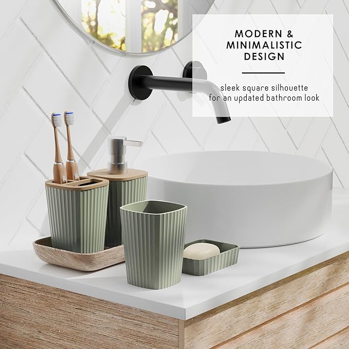 - Sage Green Bathroom Accessories Set: Incorporate Sage Green bathroom decor with our coordinated bathroom accessory set for bathroom organization. Our Sage Green bathroom set with natural bamboo accents create a stylish haven.