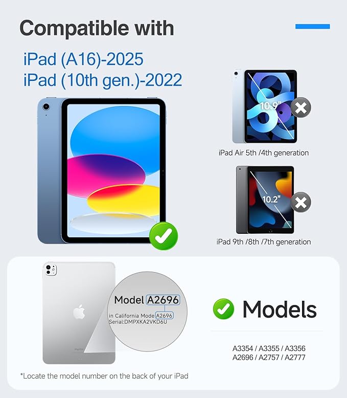 - 【Perfect Compatibility】Compatibility: Specifically compatible with iPad A16 11th gen 11inch/iPad 10th gen 10.9 Inch (2025/2022 Models), compatible with the Apple Pencil. Fit models: A3354 A3355 A3356 A2696 A2757 A2777. Please check back bottom of your device to find the model number.