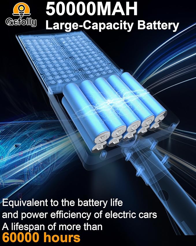 - [Solar Powered & No Electricity Bill] - Gefolly SL-11000W The solar street light is built-in 104pcs 5054 ultra bright LED lamp beads and 50000mAh battery (lifetime up to 60,000 hours). Provides a 6500K, IP67 waterproof rating, and works normally even in bad weather all year round. Solar powered, no electricity bill, auto turns on at dusk and charging during the day, Continuous lighting up to 30 hours (when fully charged). Best for commercial and home lighting. Note: The remote controls that come with the light are available in white and black. The white and black remote controls are shipped randomly.