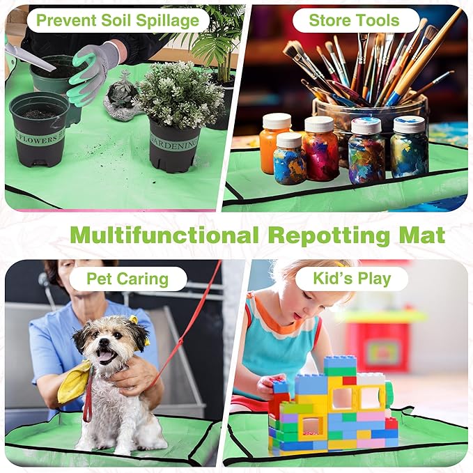 - Clean & Efficient Gardening Assistant: Equipped with a waterproof, thickened plant repotting mat featuring corner copper buckles to prevent water and soil from spilling out. Whether working indoors or outdoors, it keeps your workspace tidy, eliminating the hassle of cleaning up scattered soil