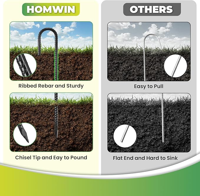 - Wide Applications - If you own any kind of tent, canopy or storage shed you know what comes with them is useless. These are perfect rebar stakes with ridges to grip the ground, widely used in camping tent, yard decorations, garden fence stakes and yard anchors.