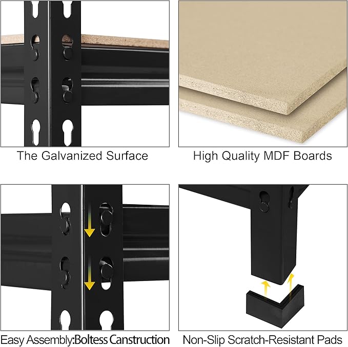 - 【10 Minutes Easy Assembly】The industrial shelving adopts a bolt-free interlocking design and can be quickly assembled in just 10 minutes. It comes with a rubber mallet and gloves to make the installation process simple and efficient. Tips: Evenly distribute the items on each shelf to ensure the stability and load-bearing capacity of the basement storage shelves