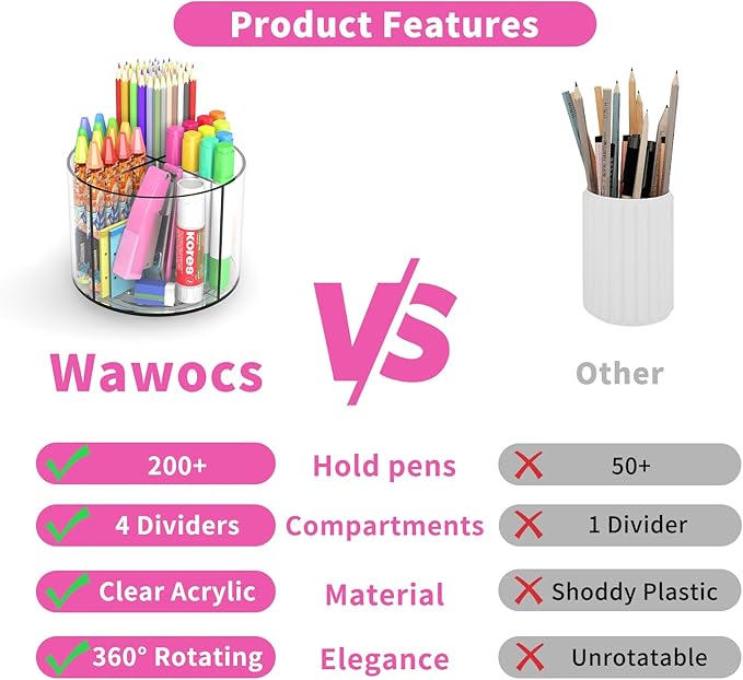 - Clear Spinning Marker Holder Organizer: Wawocs rotating acrylic clear desk top pencil and pen organizer is not only suitable for your own use but also a great organizer for kids partners family friends teachers business partners; the acrylic arts and crafts organizer is delicate and durable, ideal for desks workstations podiums dressing tables