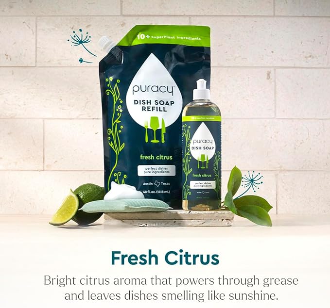 - Care For Your Dishes and Your Hands - Skip the gloves when using our dish soap liquid. Puracy Dish Soap Fresh Citrus is carefully crafted with a blend of plant-powered cleansers and moisturizers to ensure that neither your precious dishes nor delicate hands are neglected.