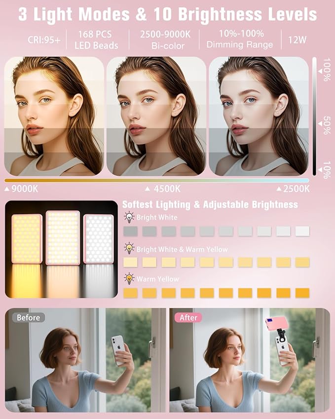 - 【168LED CRI 95+】: The 168 LED selfie light offers greater brightness compared to a 60 LED selfie light, enabling you to capture brighter and clearer photos even in low-light conditions. High CRI of 95+ is equal to a professional photography lighting, eliminate harsh shadows –The light is soft, bright, and non-glaring. Capture true-to-life colors and flawless skin tones under any condition, whether it's the vibrant hues of food or the precise representation of your makeup and outfit