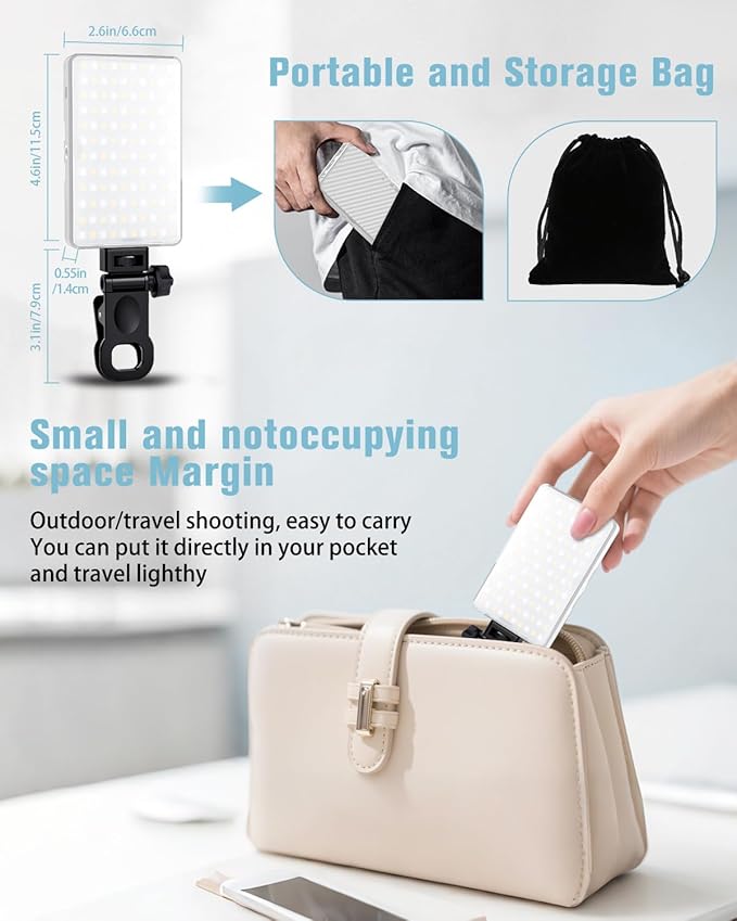 - 【Compact & Portable】The portable phone light clamp measures 4.5"x 2.6"x 0.6", Thinner than your phone (14mm) and lighter than an apple (130g). Slides into pockets for spontaneous coffee-shop shoots or cross-country flights . We also provide a portable storage bag for easy carrying while on the go