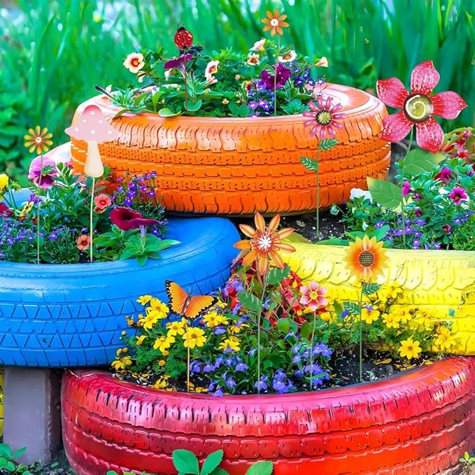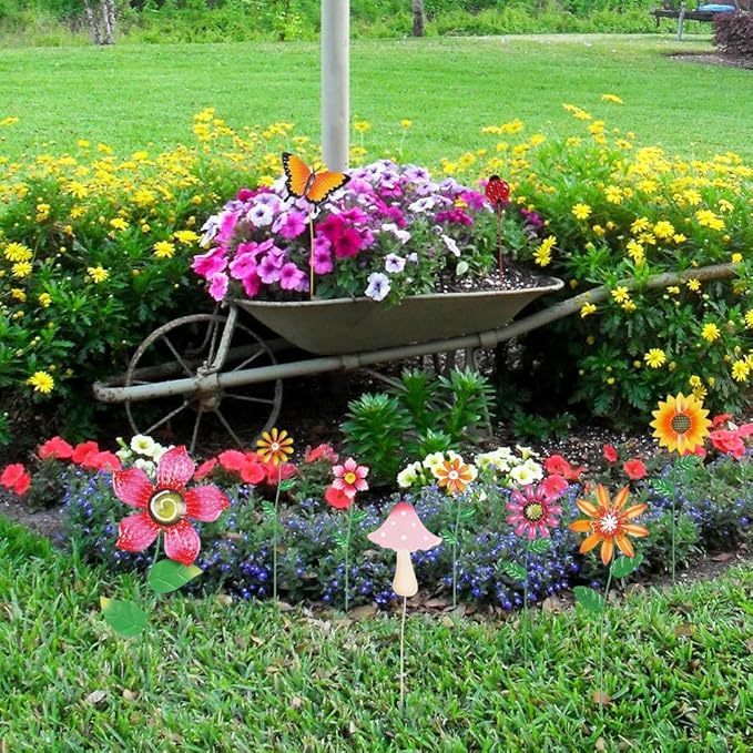- đ»ăBright Up Your GardenăThis adorable set of garden stakes will add the perfect charm to your planters, raised garden or landscape beds. Package includes 7pcs of whimsical flower in different shapes and sizes, 1 piece each of butterfly, ladybug, mushroom. Vibrant metal flower set will bring a boost of color to any yard or garden! Guests in your garden won't be able to miss these beautiful and unique metal flower garden stakes!