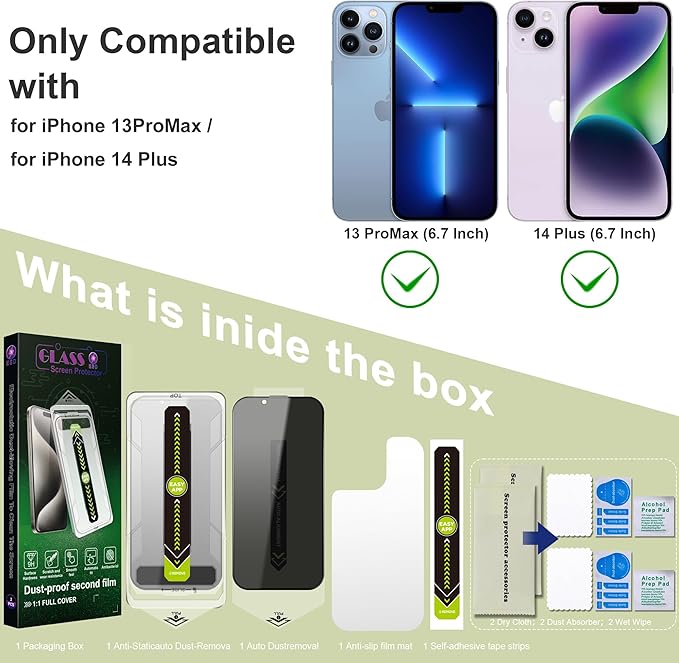 (2-Pack Anti-Spy Privacy Screen Protector for iPhone 13 Pro Max/14 Plus(6.7-Inch),9H Tempered Glass,Full Coverage,Anti-Fingerprint,Auto Dust Removal,Bubble-Free,Easy Installation