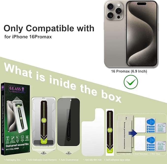 - Auto Dust Removal & Easy Installation: The SY SHANGYAN Anti-Spy Privacy Screen Protector for iPhone 16 Pro Max features advanced auto dust removal and self-aligning technology for a flawless,bubble-free install every time.Just place the frame,pull the tab,and press to push out any air bubbles.Installation is quick,easy,and hassle-free.For best results,watch our step-by-step installation video before applying