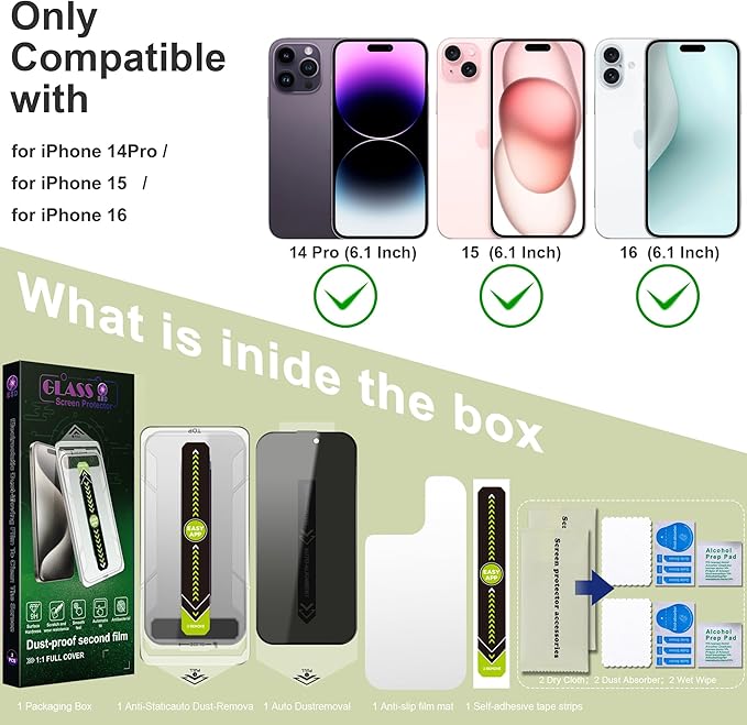 (2-Pack Anti-Spy Privacy Screen Protector for iPhone 14 Pro/15/16(6.1-Inch),9H Tempered Glass,Full Coverage,Anti-Fingerprint,Auto Dust Removal,Bubble-Free,Easy Installation