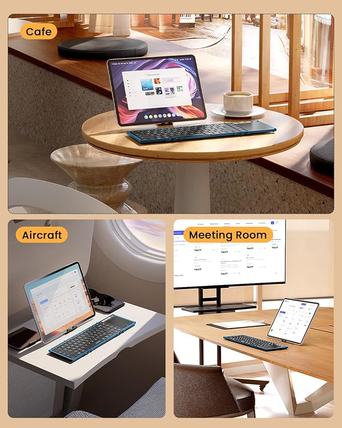 - Portable for Travel: The collasible keyboard can folds into a small size(8.46 x 4.68 x 0.78 inch) for taking on the go.Come with phone stand and small PU leather bag specially designed for this keyboard.It effortlessly fits into your handbag, can be an ideal companion for your travels, coffee shop visits, business trips, flights, and more (We recommend using the keyboard on flat surface because the fold hinge can not locking)