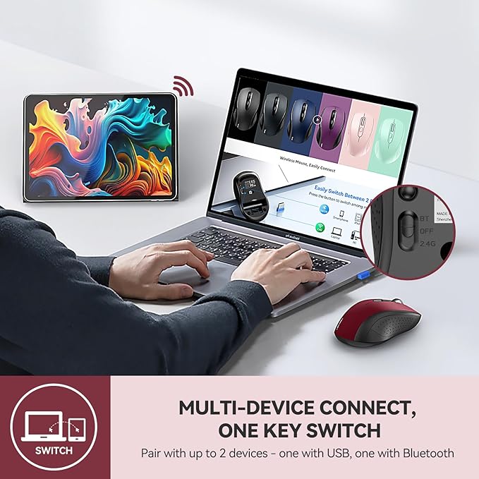 - Multi-Mode Connectivity: wireless mouse switches between 2 devices via BT5.0/BT3.0/2.4GHz. Compatible with laptops/tablets/MacBooks, realizes free switches between 2 devices(with Bluetooth mode and 2.4G mode) in a switch button on the computer mouse wireless.
